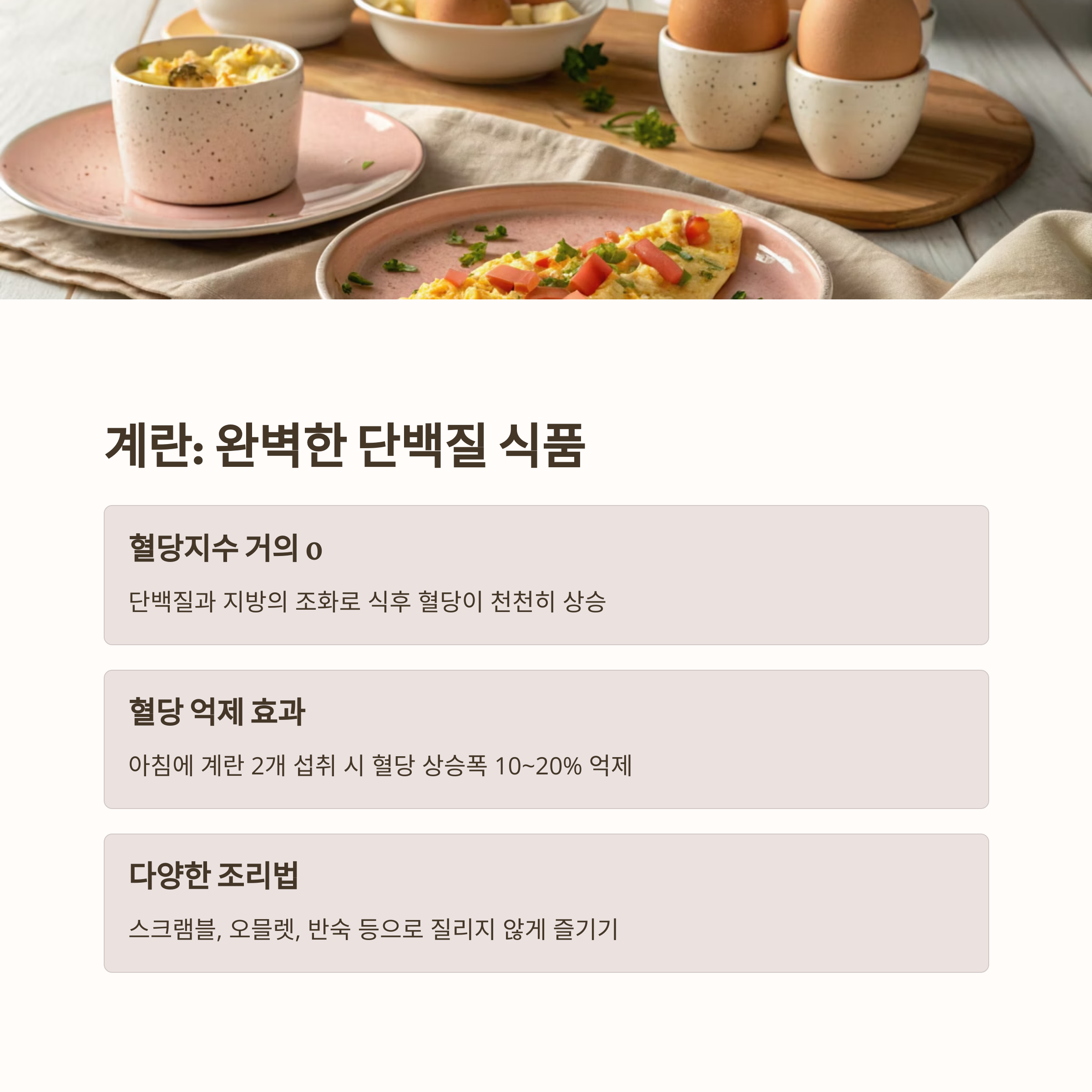 계란은 혈당지수가 거의 0에 가까운 대표적인 단백질 식품입니다