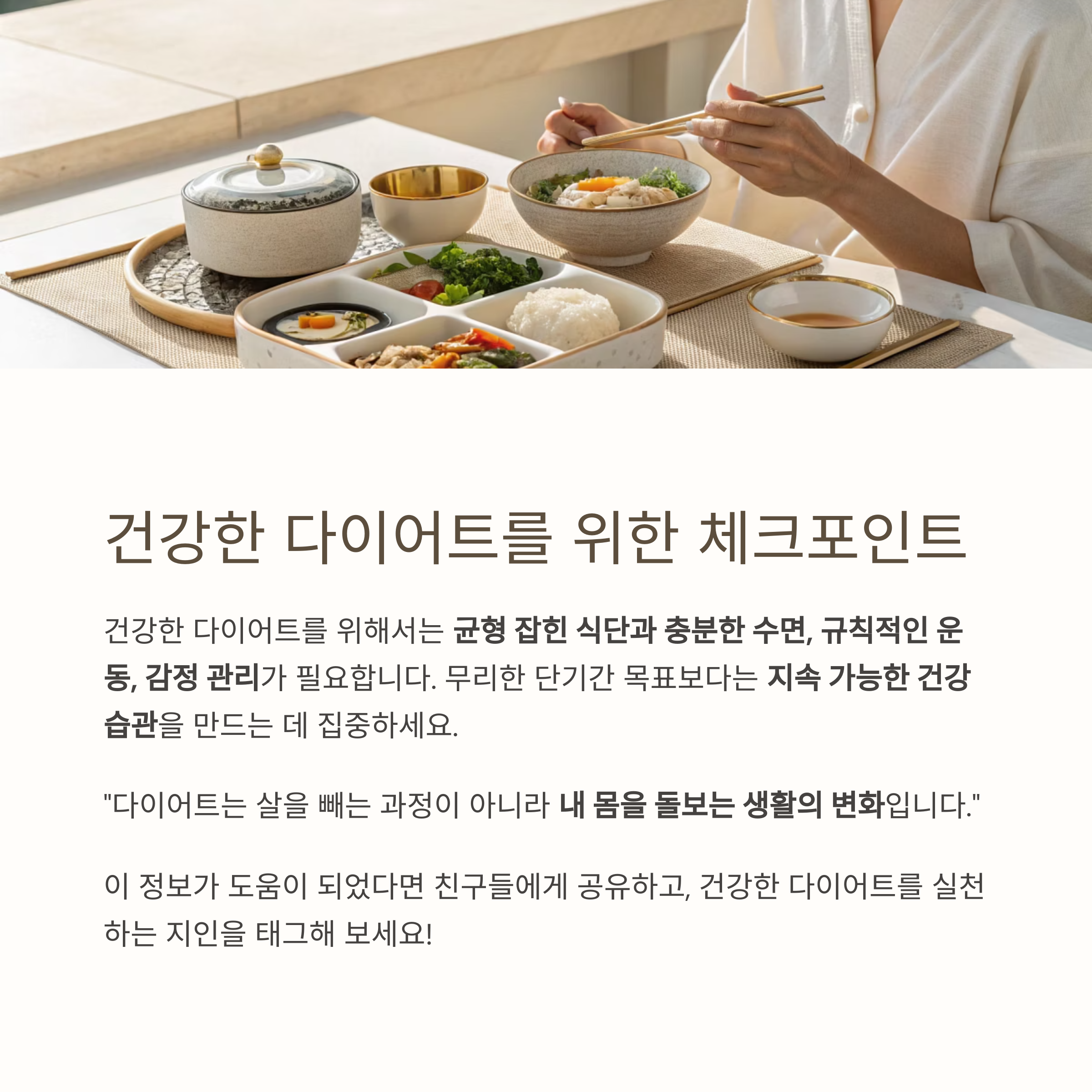 "다이어트는 살을 빼는 과정이 아니라 내 몸을 돌보는 생활의 변화입니다."