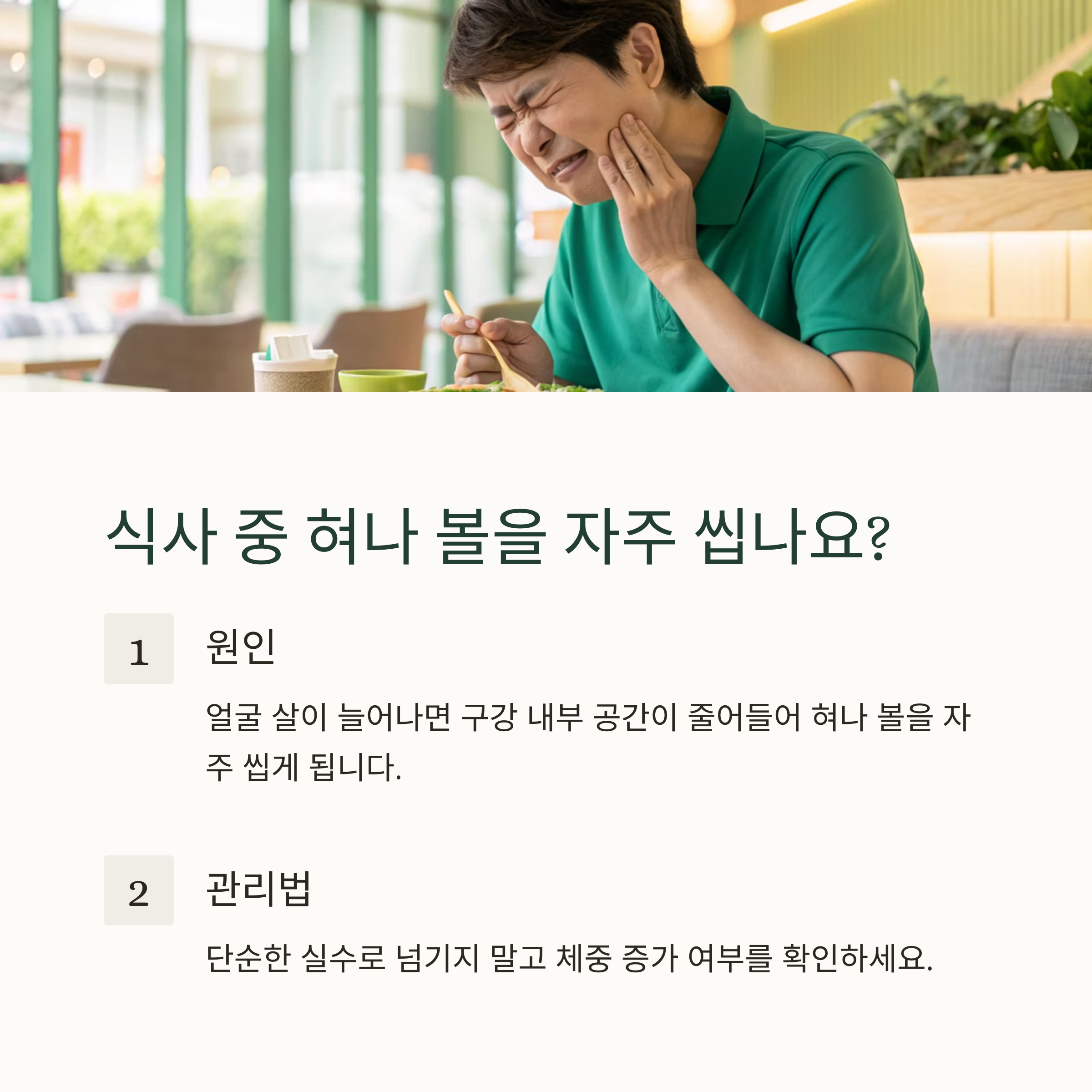얼굴 살이 늘어나면 구강 내부 공간이 줄어들어 혀나 볼을 자주 씹게 됩니다.