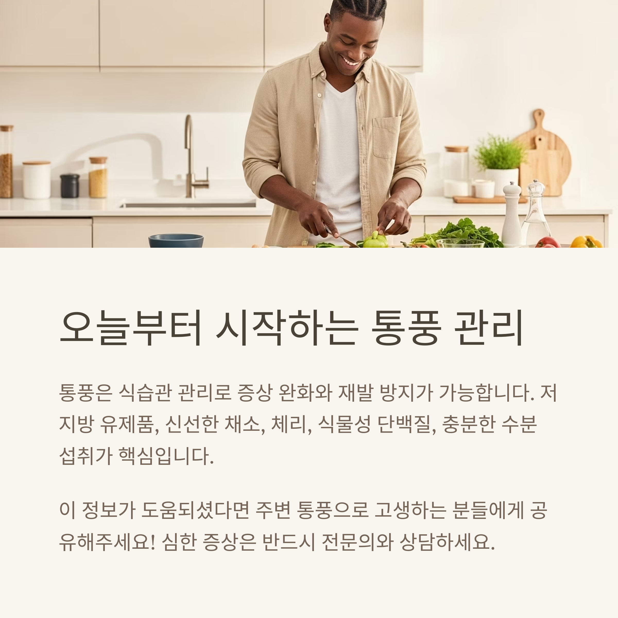 통풍은 식습관을 잘 관리하면 충분히 증상 완화와 재발 방지가 가능합니다. 저지방 유제품과 신선한 채소, 체리, 식물성 단백질, 충분한 수분 섭취가 핵심입니다. 반면 고퓨린 식품과 알코올, 가공식품은 반드시 피해야 합니다. 오늘부터 식단을 점검하고 건강한 습관을 실천한다면 통풍으로 인한 극심한 통증에서 벗어날 수 있습니다. 증상이 지속되거나 심할 경우에는 반드시 전문의의 상담과 치료를 병행해야 합니다.