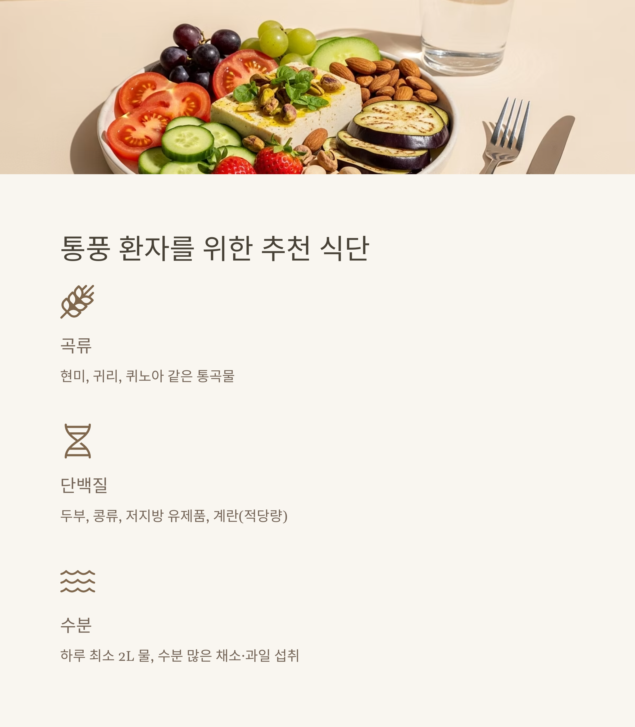 • 수분: 하루 최소 2L 물, 수분 많은 채소·과일