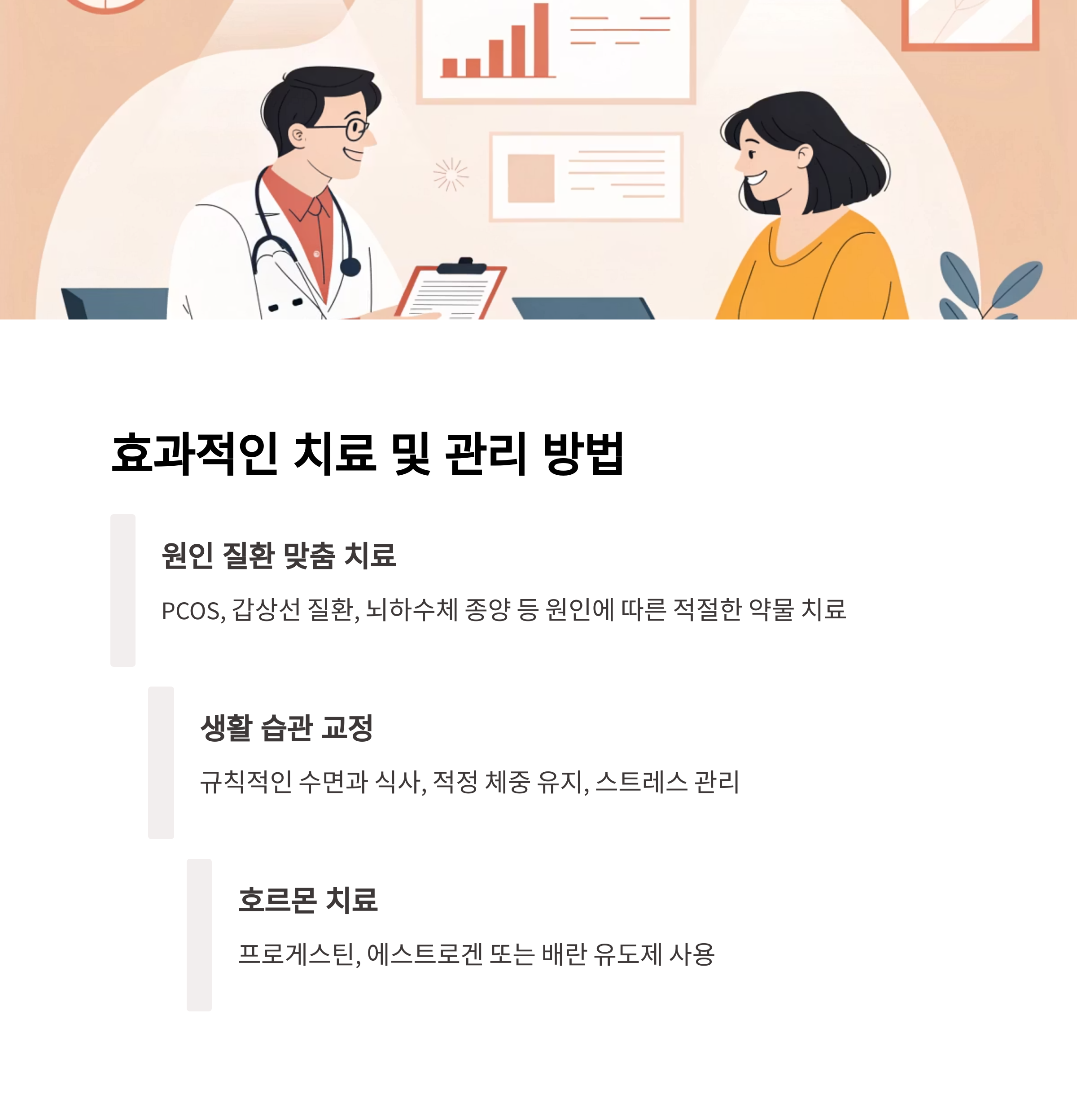 장기 무월경의 경우 프로게스틴 또는 에스트로겐 등을 활용한 호르몬 치료가 권장됩니다. 임신을 원하는 경우 배란 유도제를 사용할 수 있습니다.