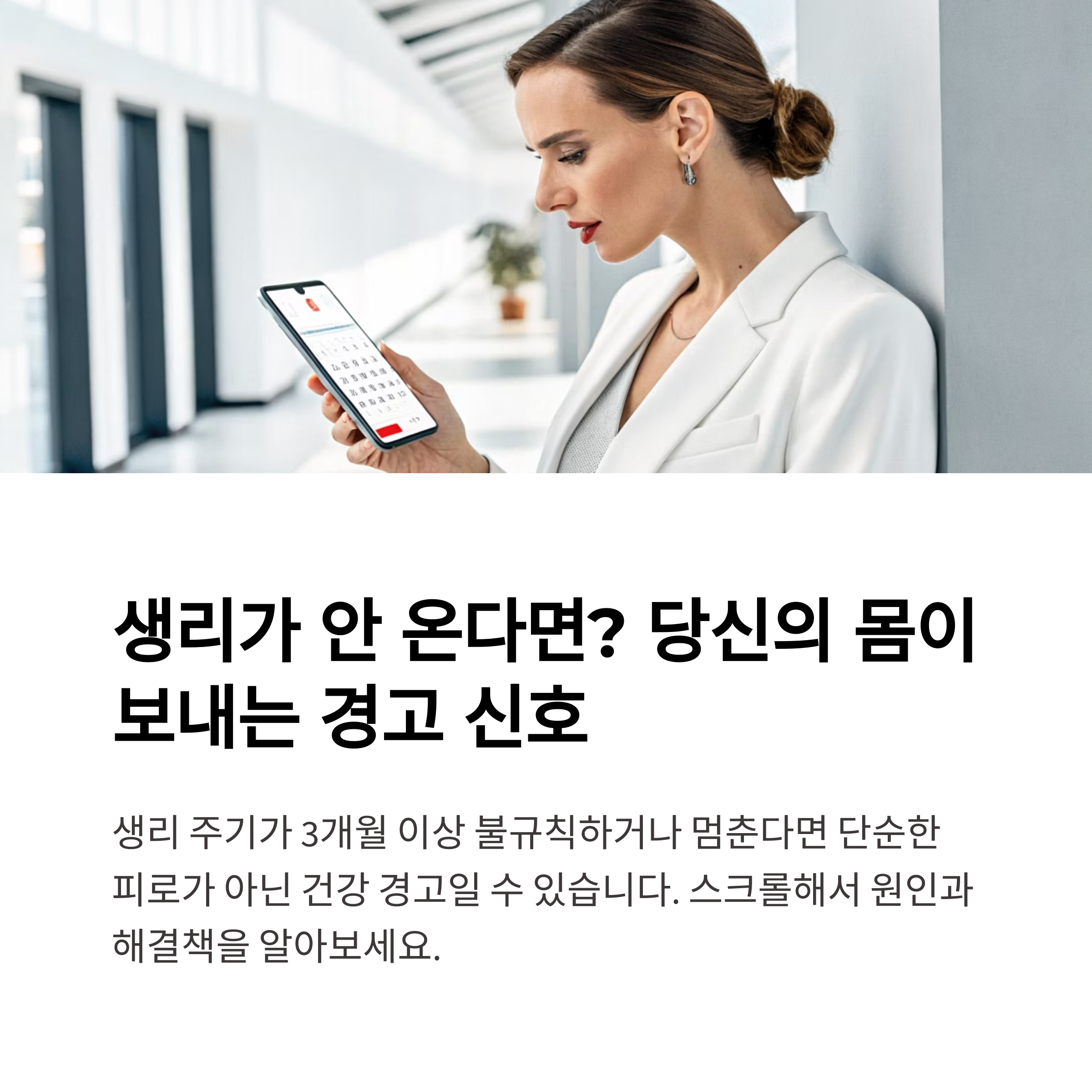 “생리불순이나 무월경은 여성 건강의 중요한 신호입니다. 3개월 이상 지속되면 반드시 전문의 상담과 검진을 받으세요.”