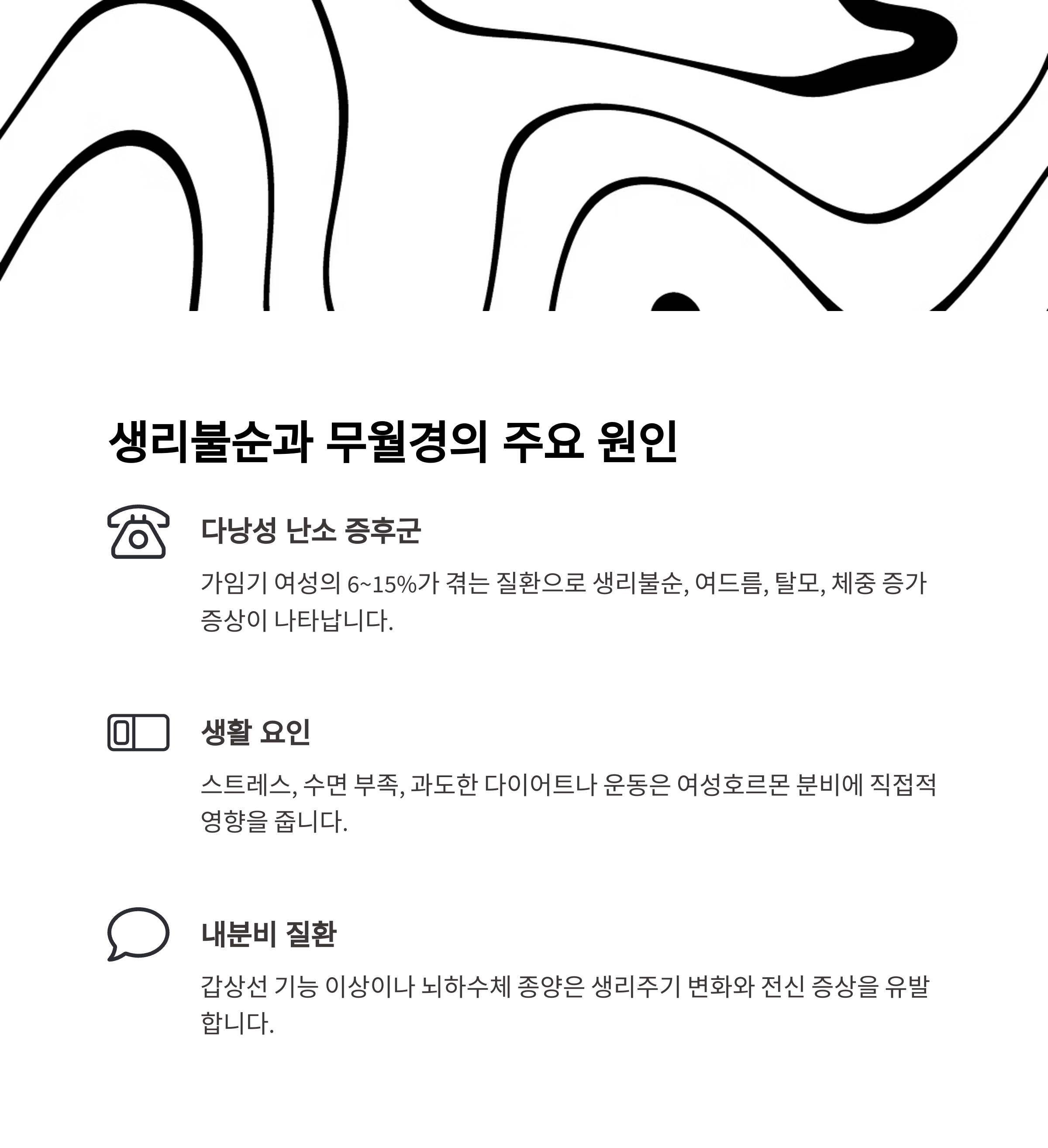 생리불순이나 무월경은 여성 건강의 중요한 경고 신호입니다. 특히 3개월 이상 생리가 없을 경우, 단순한 일시적 증상으로 보기보다는 반드시 그 원인을 파악해야 합니다. 원인 질환을 조기에 발견하고 생활습관을 개선하면 생리 주기를 회복하고, 건강한 삶을 유지하는 데 큰 도움이 됩니다.