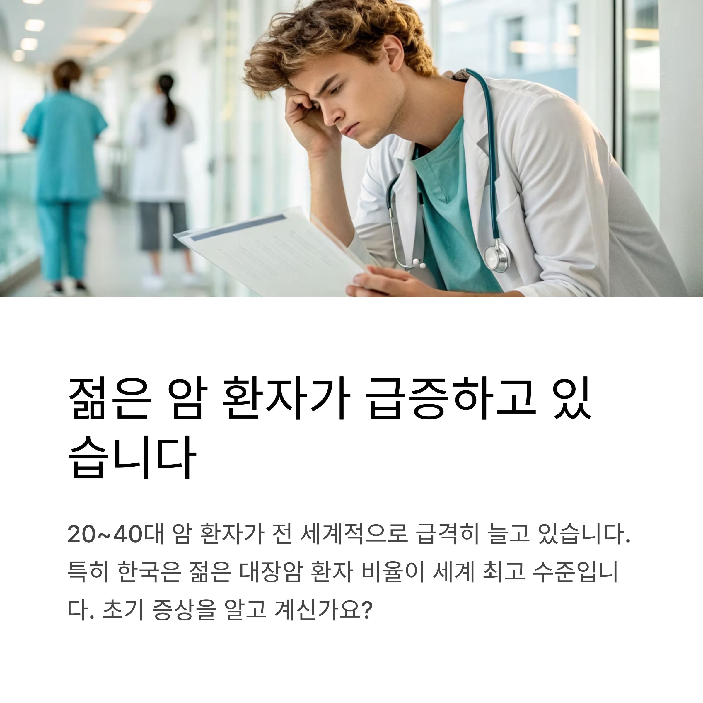 젊은 암 환자들의 문제는 대부분 진단 시기가 늦는 것입니다. 청년층은 스스로 암을 의심하지 않기 때문에, 초기 증상을 간과하고 병원을 늦게 찾는 경우가 많습니다. 이로 인해 진단 시점에는 이미 병기가 상당히 진행된 경우가 많고, 예후가 나빠질 가능성이 높습니다.