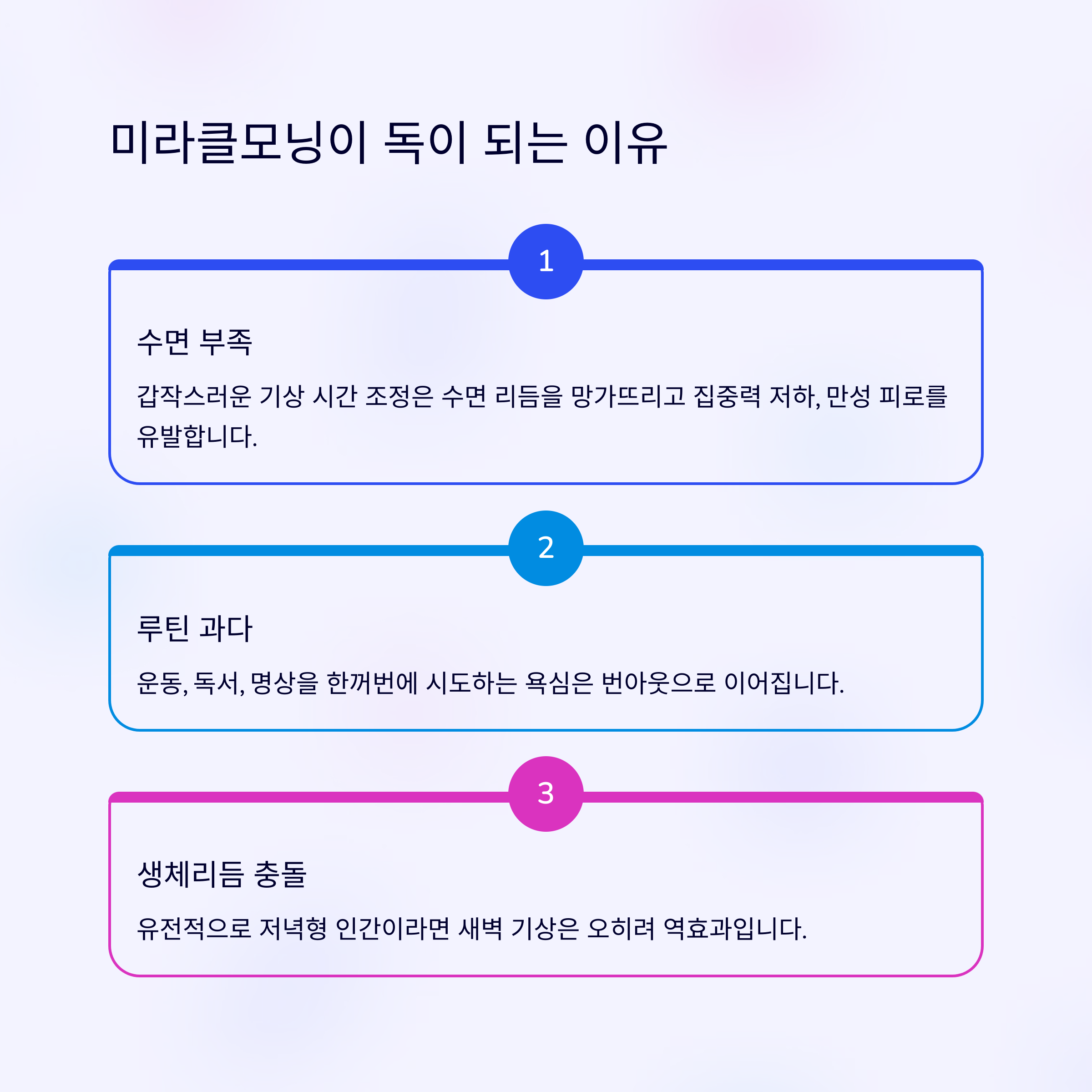 ‘미라클모닝’은 성공한 사람들의 습관이 아니라, 나에게 맞는 생활 패턴을 찾아가는 과정이 되어야 한다. 무리한 수면 조절, 타인의 루틴 복사, 성과 집착은 모두 실패를 부르는 지름길이다.