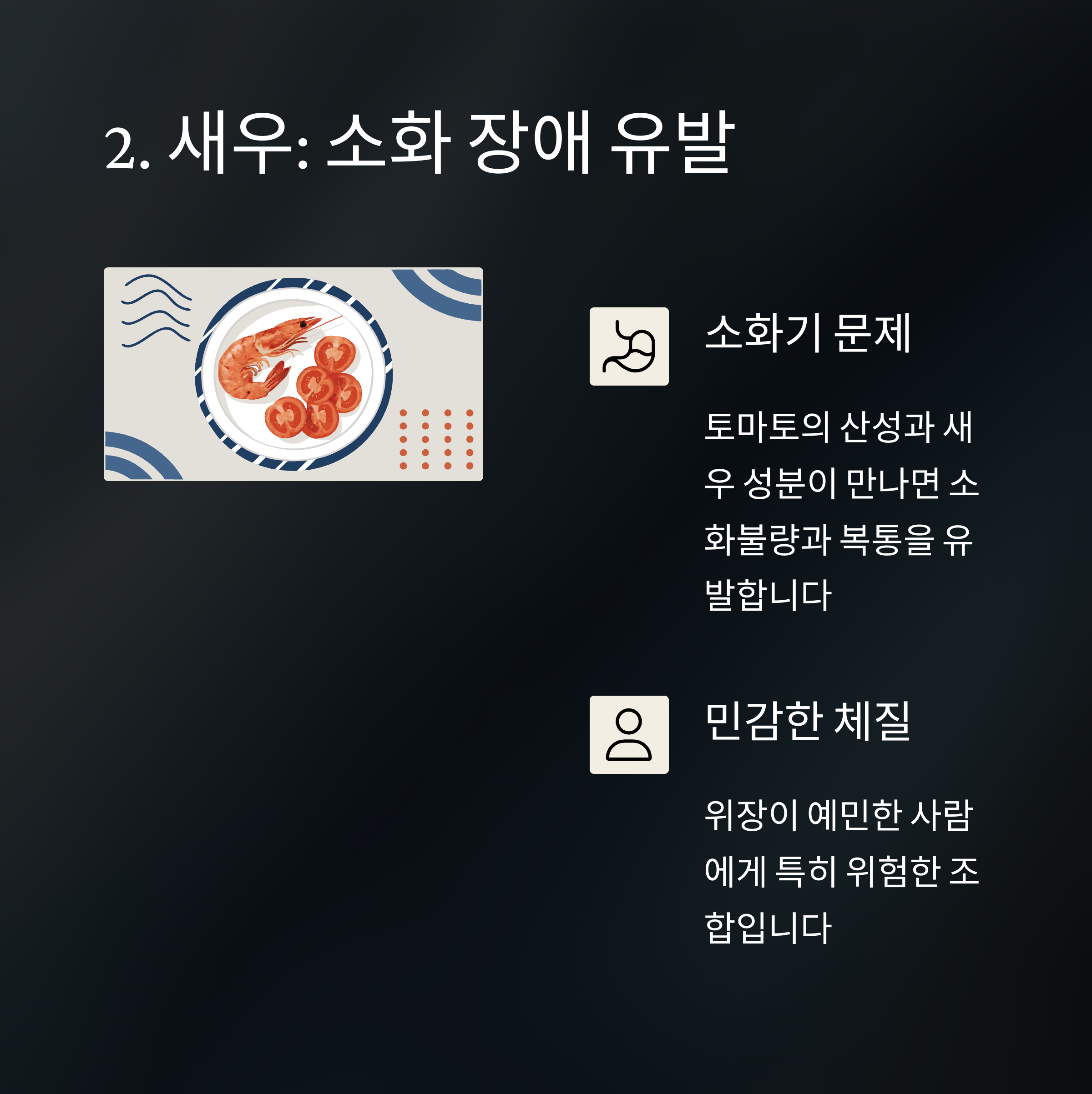 | 토마토 + 새우 | 소화 효소 충돌, 복통, 구토, 소화불량 |
