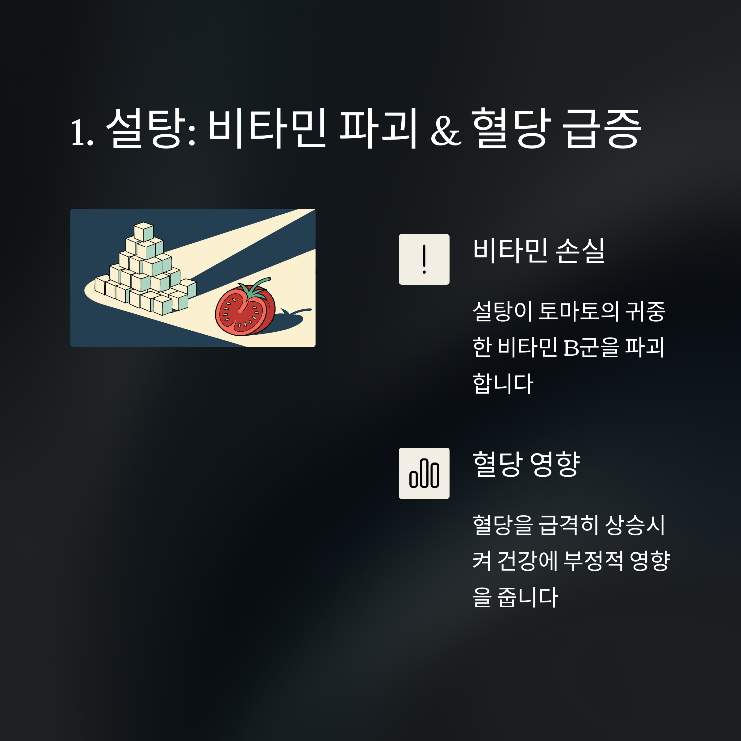 - 설탕은 토마토에 들어 있는 비타민 B1을 분해하는 데 쓰이기 때문에, 토마토가 원래 가지고 있던 영양소를 제대로 흡수하지 못하게 만듭니다.