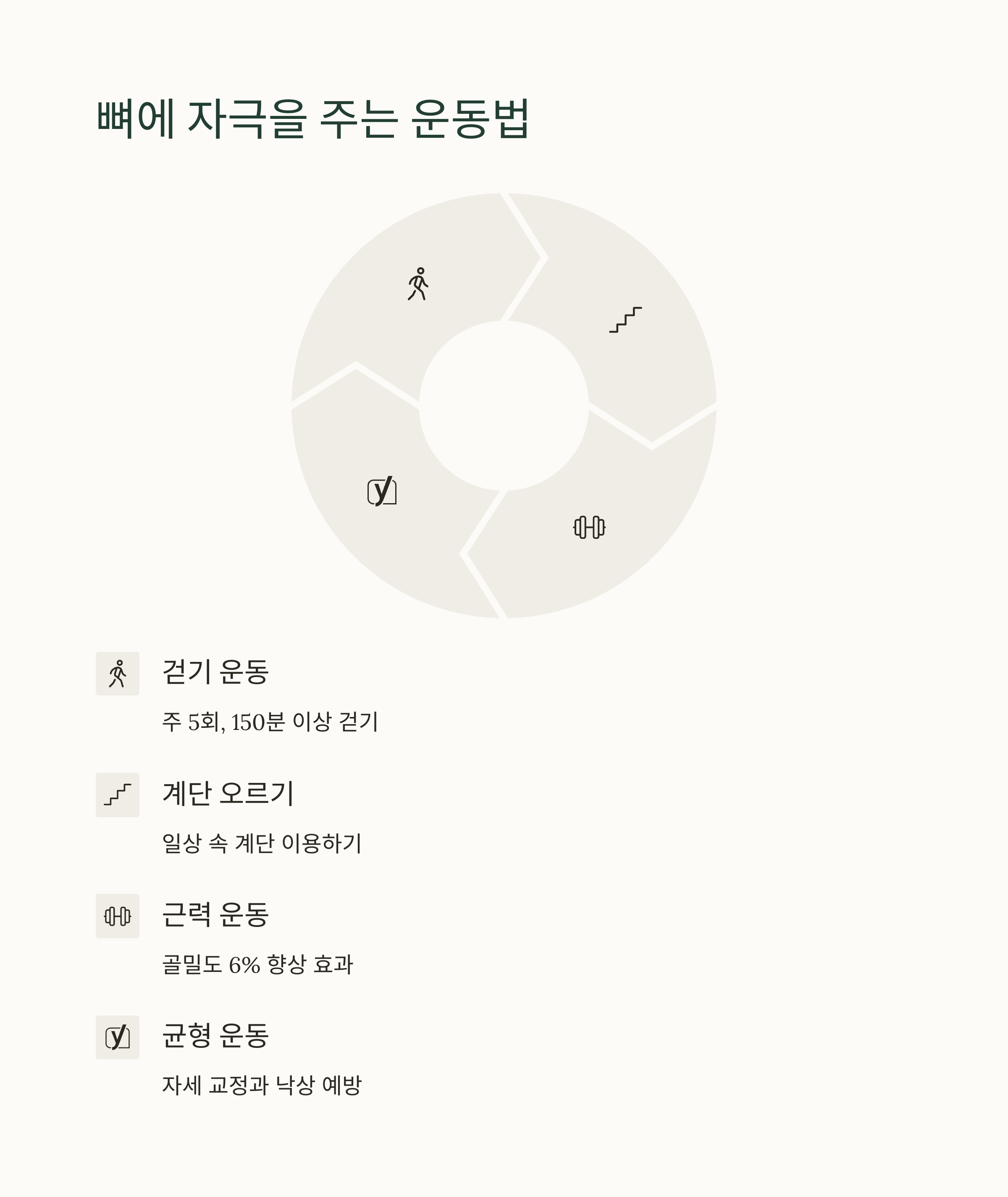 뼈는 사용하지 않으면 약해지고, 지속적으로 자극을 주면 강해지는 특성을 가진다. 특히 체중이 실리는 운동과 근력 강화 운동은 뼈를 강화하고 골밀도를 높이는 데 효과적이다. 걷기, 조깅, 계단 오르기 같은 유산소 운동은 주 5회 이상, 하루 30분 이상 실천하는 것이 이상적이다. 또한, 웨이트 트레이닝이나 밴드 운동처럼 근육을 자극하는 활동은 주 2~3회 꾸준히 하는 것이 좋다. 요가나 태극권 같은 균형 운동은 낙상 예방에도 도움이 되기 때문에 매일 실천하면 좋다.