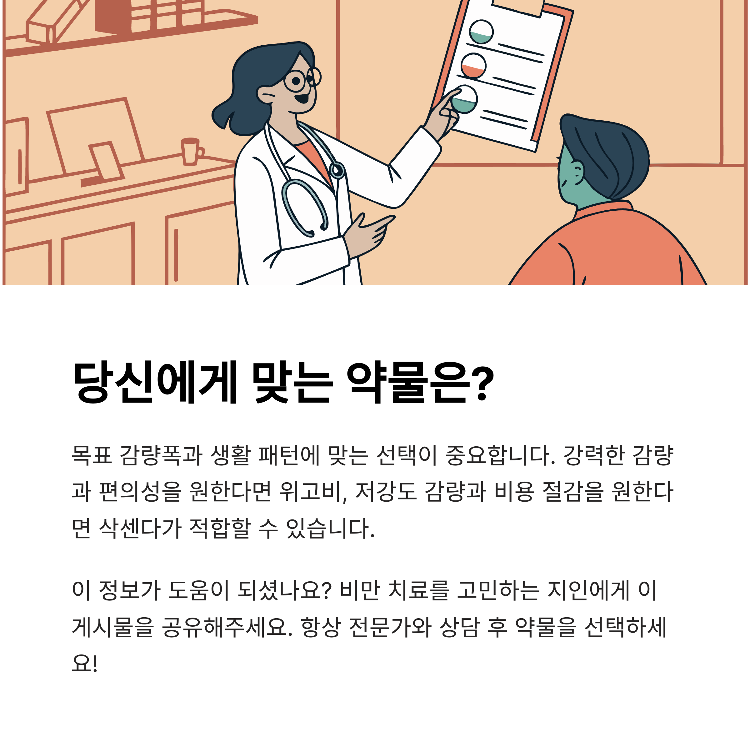 | 간질환 개선 효과가 일부 확인된 바 있습니다. | 오랜 임상 경험과 안정성이 장점입니다. | 임상 결과: 위고비 15%, 삭센다 7.5% 감량 |