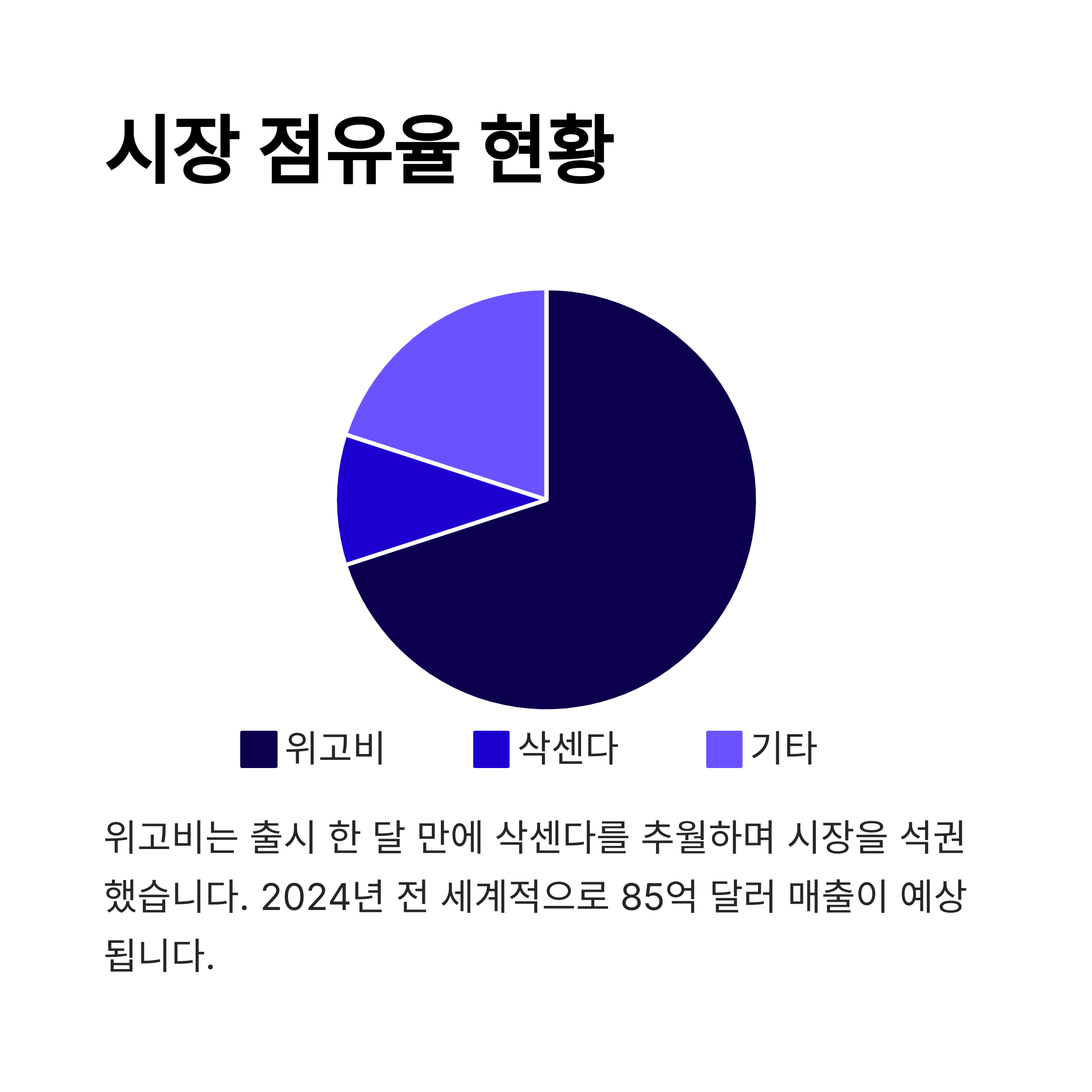 위고비는 2023년 국내 출시 후 빠르게 시장 점유율을 확대하며 삭센다를 대체하고 있습니다. 2025년 1월 기준으로 위고비는 2만 건이 넘는 처방 수를 기록했고, 시장 점유율은 70% 이상으로 상승했습니다. 반면 삭센다는 같은 기간 처방 수가 급감하며 10% 미만으로 하락했습니다. 이는 주사 횟수, 체중 감량 효과, 부작용 등을 종합적으로 고려한 결과로 해석됩니다. 특히 위고비는 간 질환 개선 효과도 보고된 바 있어 복합 질환을 가진 환자에게 긍정적인 평가를 받고 있습니다.