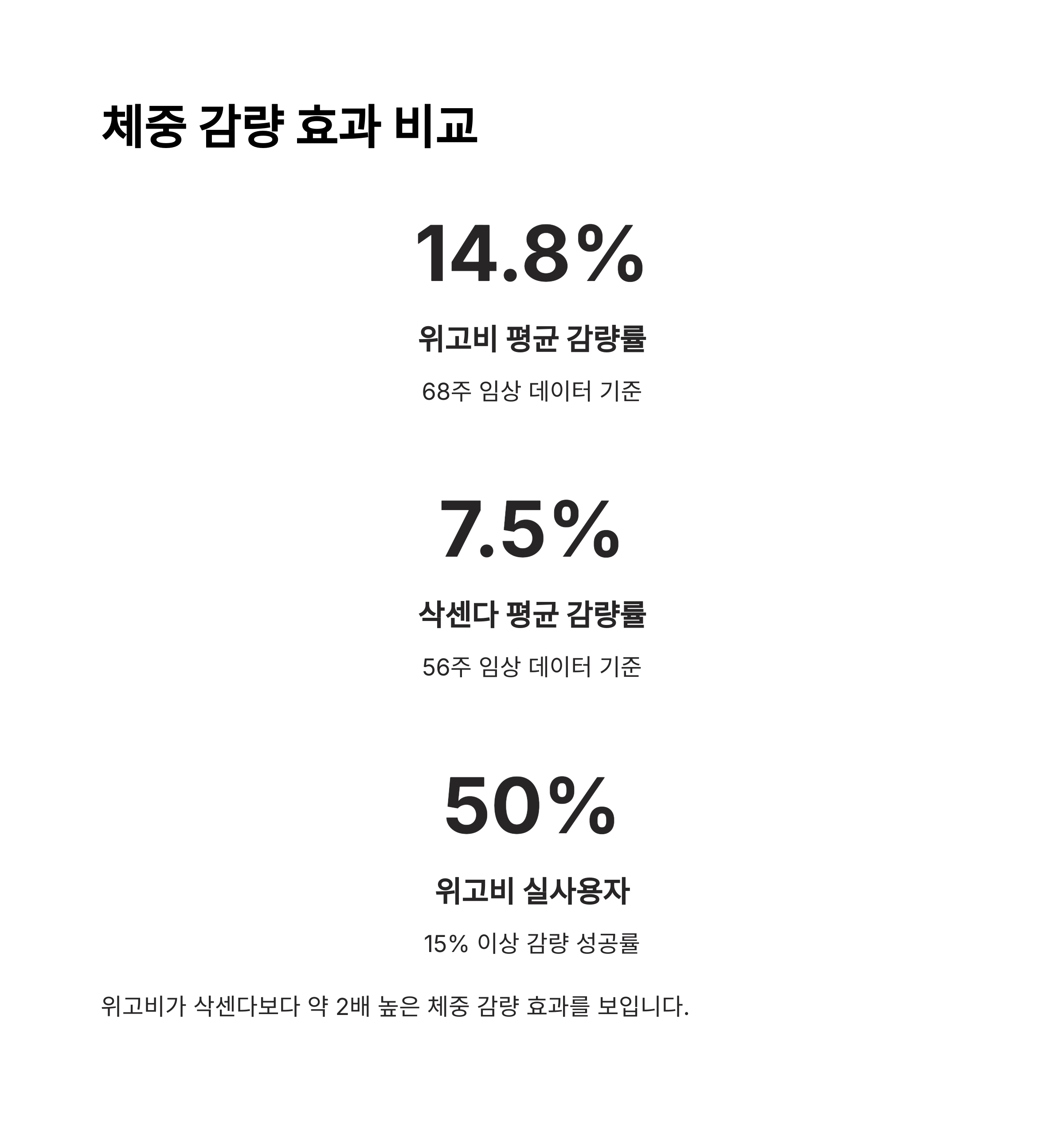 | 체중 감량 효과 | 위고비는 평균 15%, 삭센다는 7.5% 감량 효과입니다. |