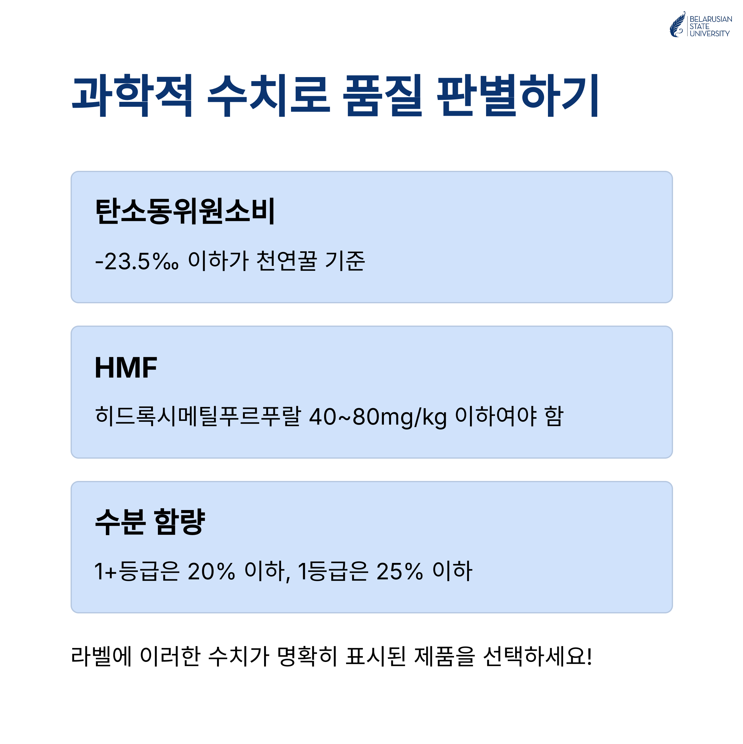 꿀의 진위를 판단하는 데 중요한 과학적 기준으로는 HMF 수치, 탄소동위원소비(δ13C), 수분 함량 등이 있습니다. HMF는 저장 중에 생성되는 화합물로, 수치가 낮을수록 꿀의 신선도가 높다고 할 수 있습니다. 또, 탄소동위원소비는 꿀벌이 자연적으로 식물을 통해 수집한 당분인지, 아니면 인공적으로 급여된 설탕 시럽인지를 구분해주는 과학적 근거가 됩니다. 이 수치가 –23.5‰ 이하일 때 천연벌꿀로 인정되며, 국내에서도 해당 기준을 적극적으로 도입하고 있습니다.