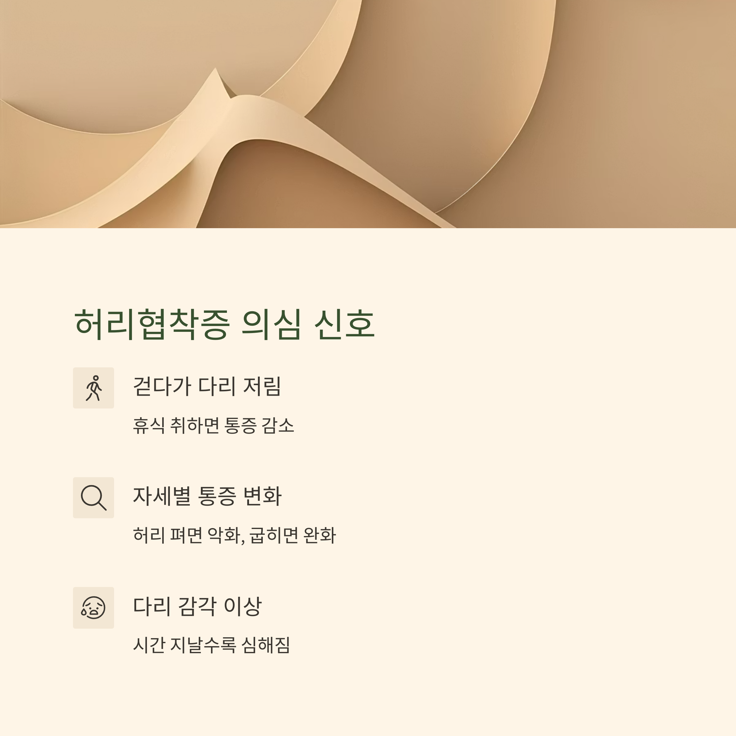 다리 감각 이상 또는 무력감 | 시간이 지날수록 심해짐, 운동 기능 저하 가능성 있음 |