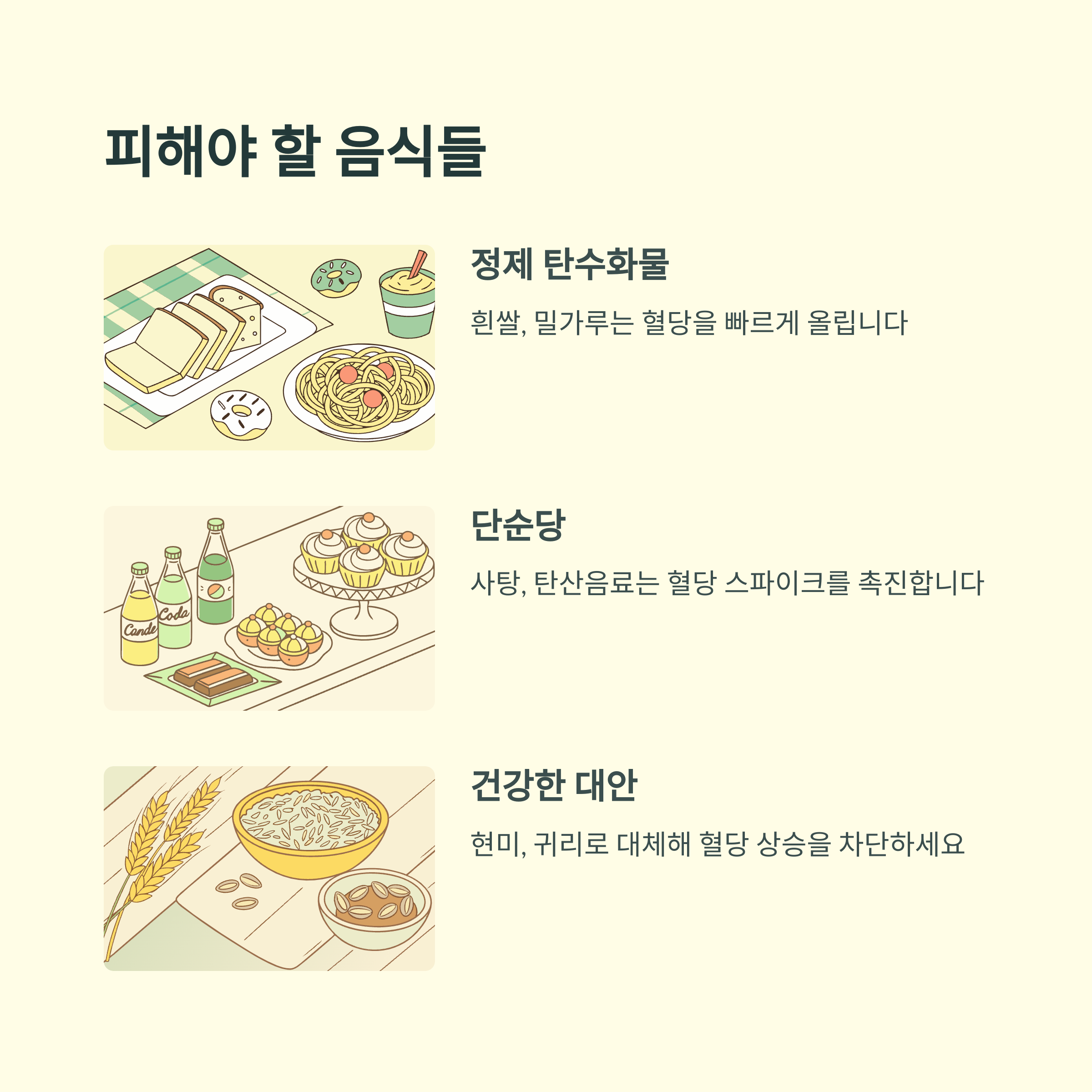 단순당·정제 탄수화물 제한 | 급격한 혈당 상승 방지 | 당류 섭취 시 혈당 급상승 |
