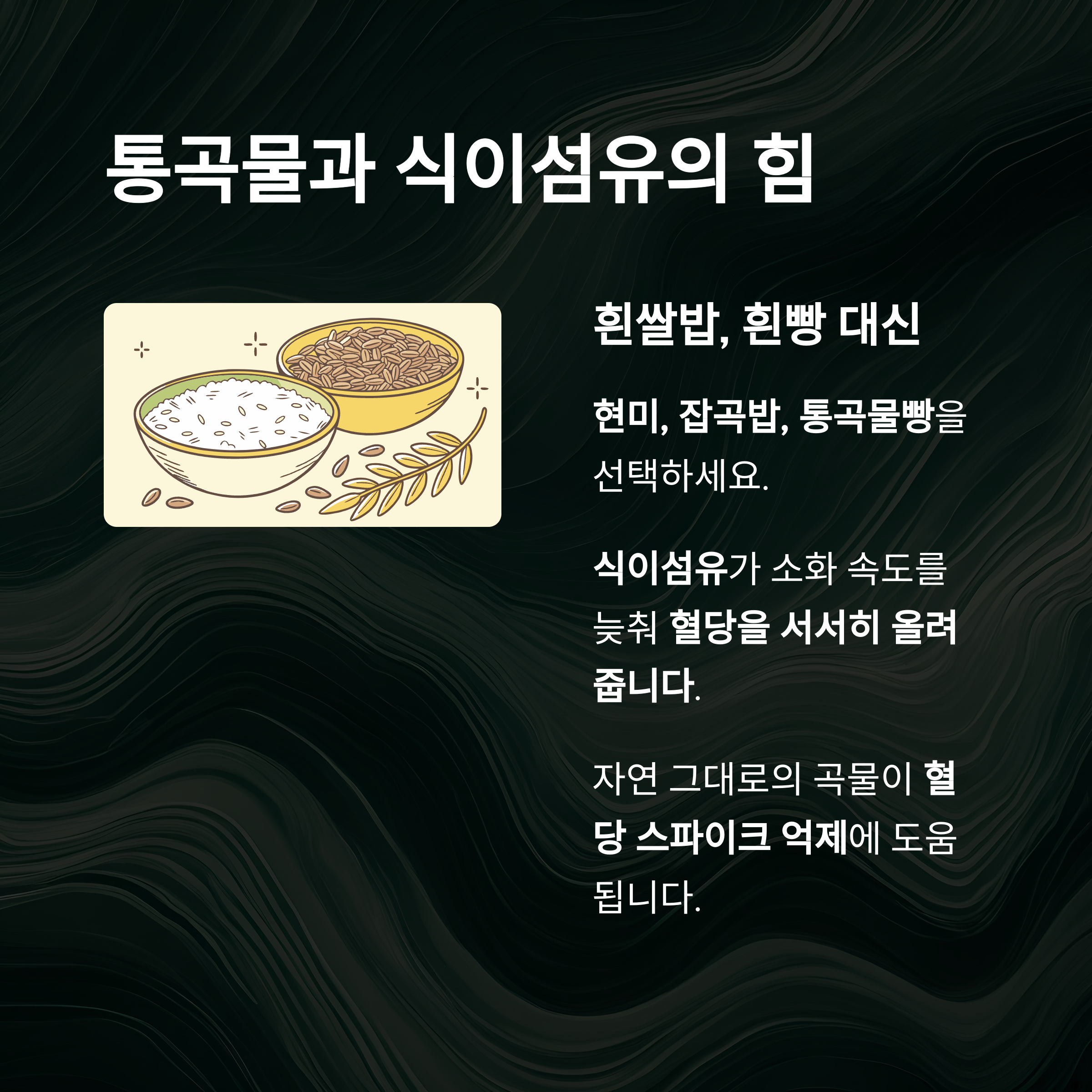 | 식이섬유·통곡물 섭취 | 혈당 스파이크 억제 | 식이섬유 섭취 시 혈당 완만 상승 |