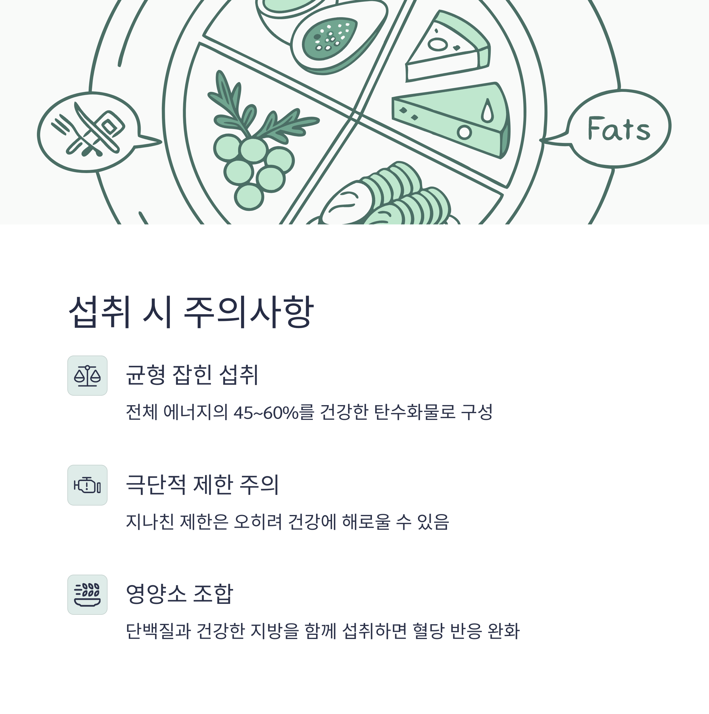 - 같은 탄수화물 함량이라도 식이섬유, 단백질, 지방을 함께 섭취하면 혈당 반응이