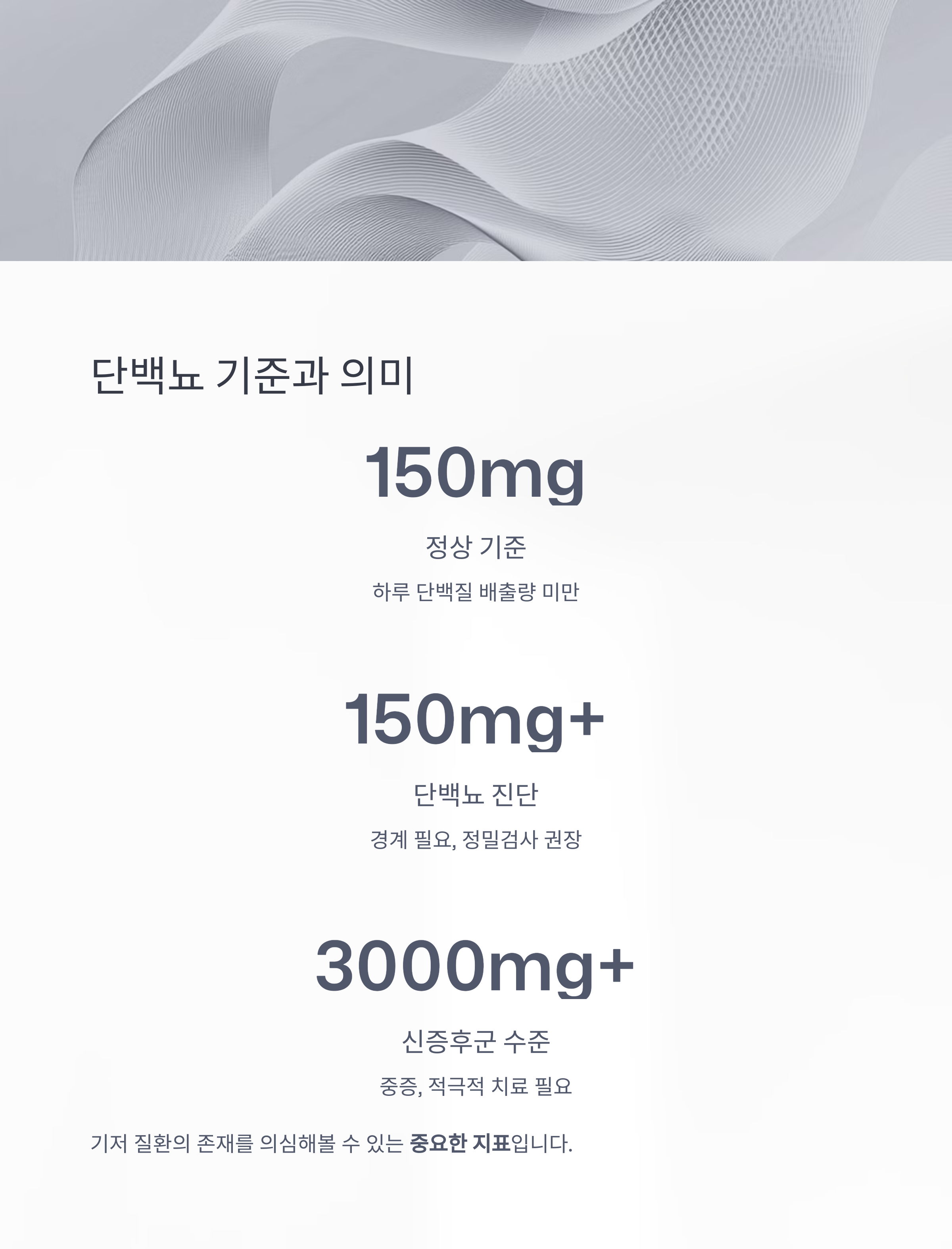 신증후군 수준 | 3.0g(3000mg) 이상 | 중증, 적극적인 치료 필요 |
