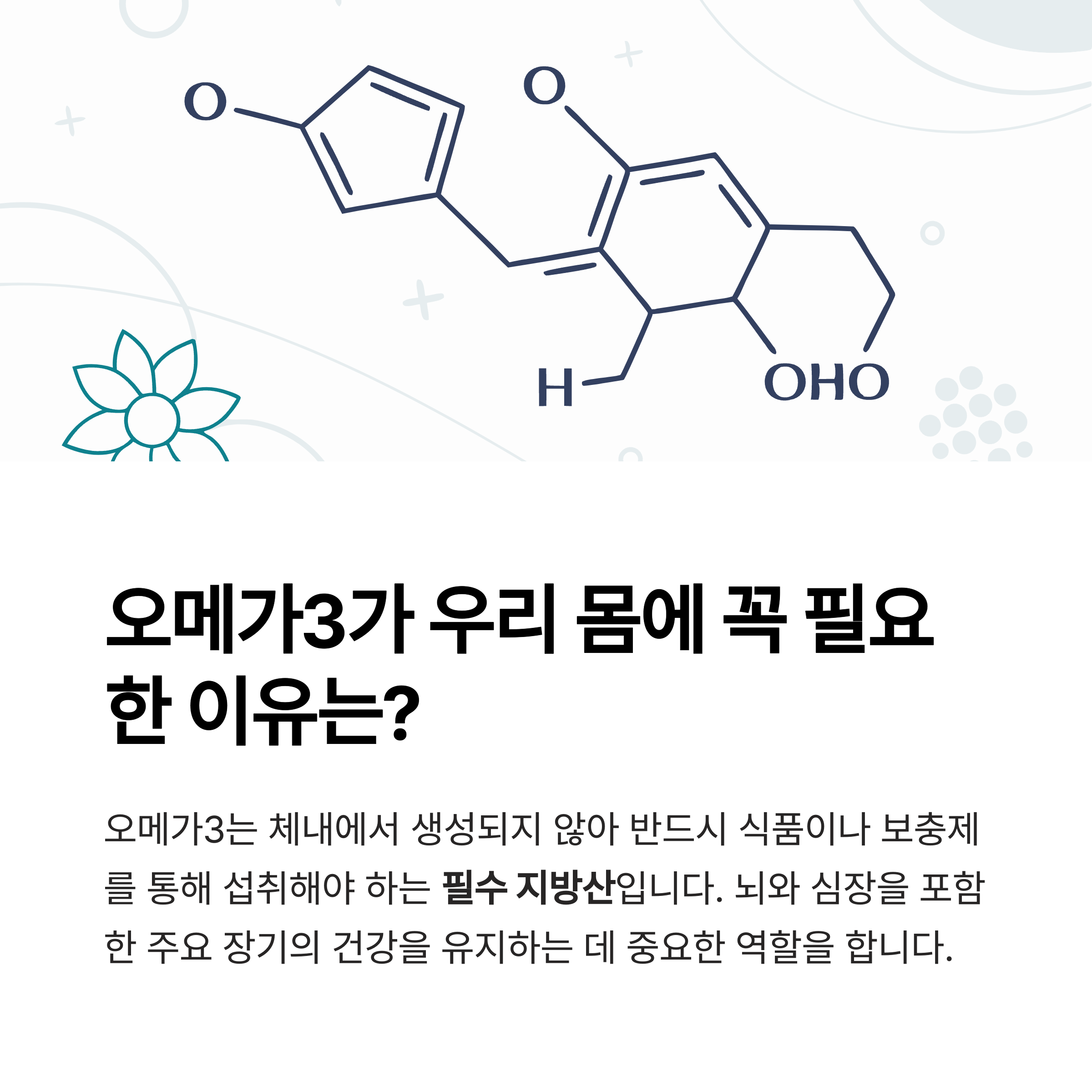 오메가3는 체내에서 생성되지 않아 반드시 식품이나 보충제를 통해 섭취해야 하는 필수 지방산입니다.