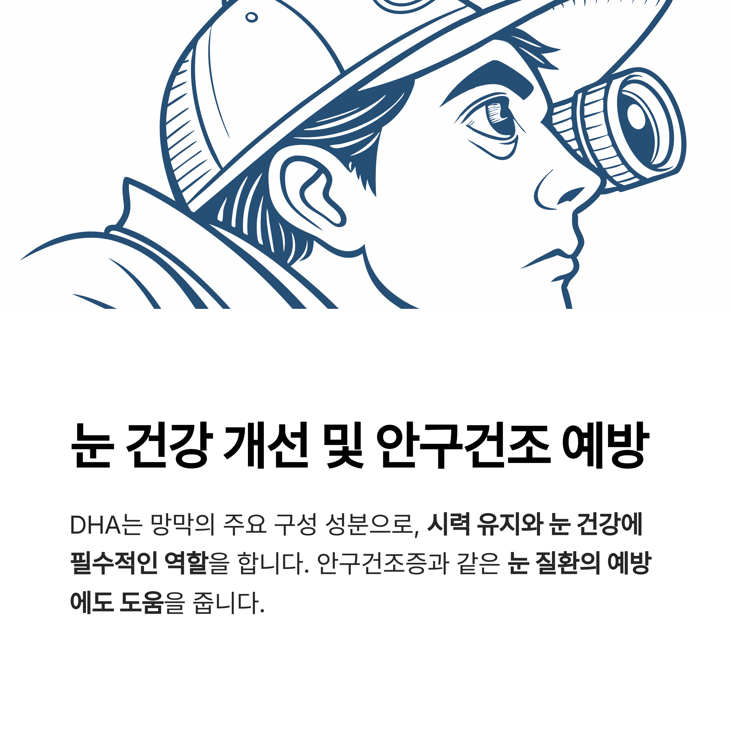 DHA는 망막의 주요 구성 성분으로, 시력 유지와 눈 건강에 필수적인 역할을 합니다.