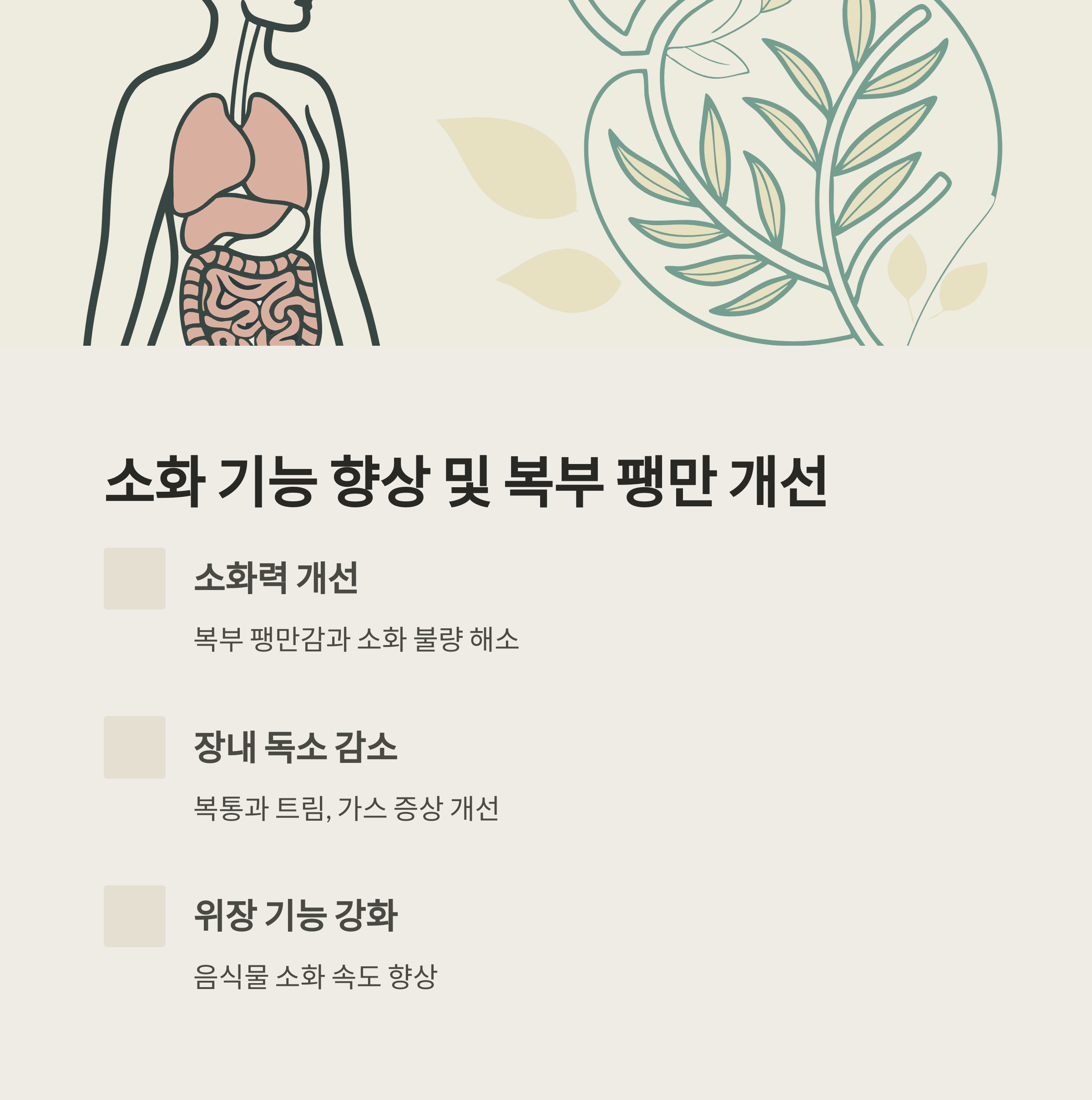 평소 위장 기능이 약하거나 음식물 소화가 느린 분들에게 효과적일 수 있습니다.