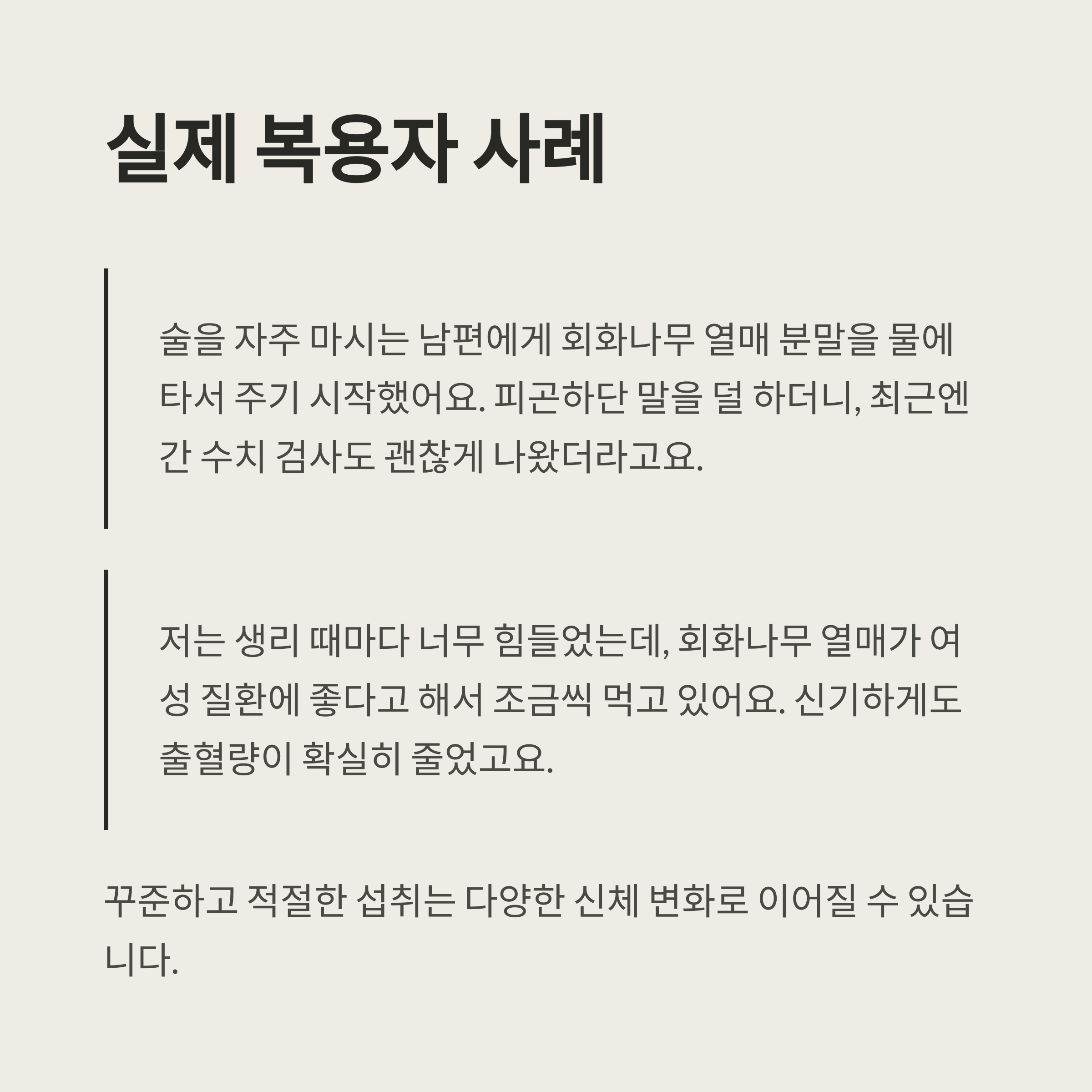 이처럼 꾸준하고 적절한 섭취는 다양한 신체 변화로 이어질 수 있습니다.