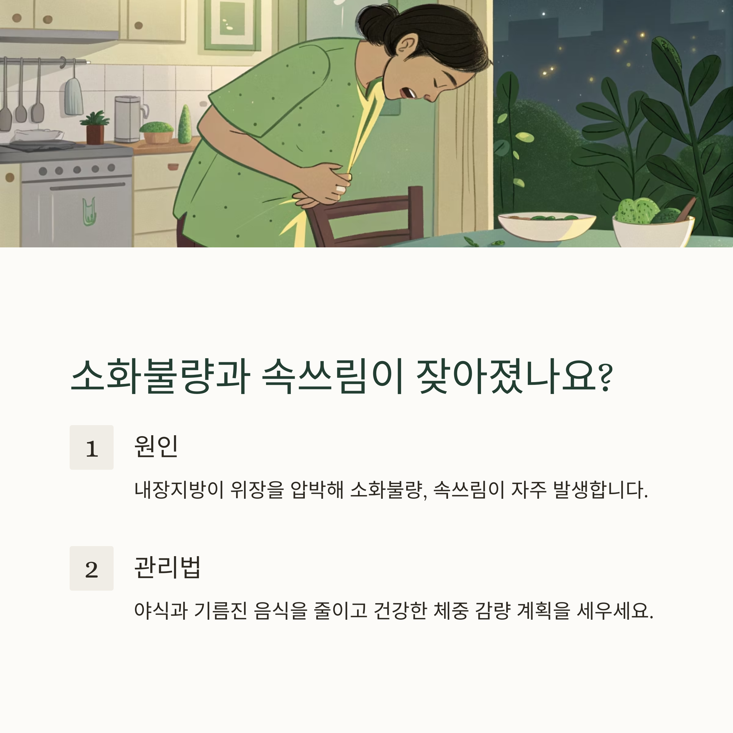 체중이 늘면 내장지방이 위장을 압박해 소화불량, 속쓰림이