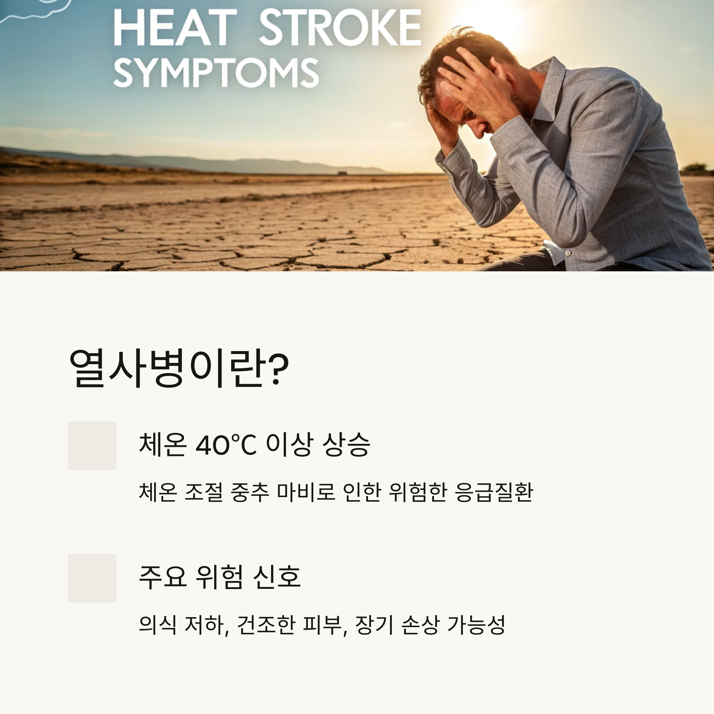 열사병은 체온 조절 중추가 마비되며 체온이 40℃ 이상으로 치솟고, 의식 저하와 장기 손상으로 이어질 수 있는 응급질환입니다. 특히 땀이 나지 않고 피부가 건조하고 뜨거워진다면 매우 위험한 상태입니다.