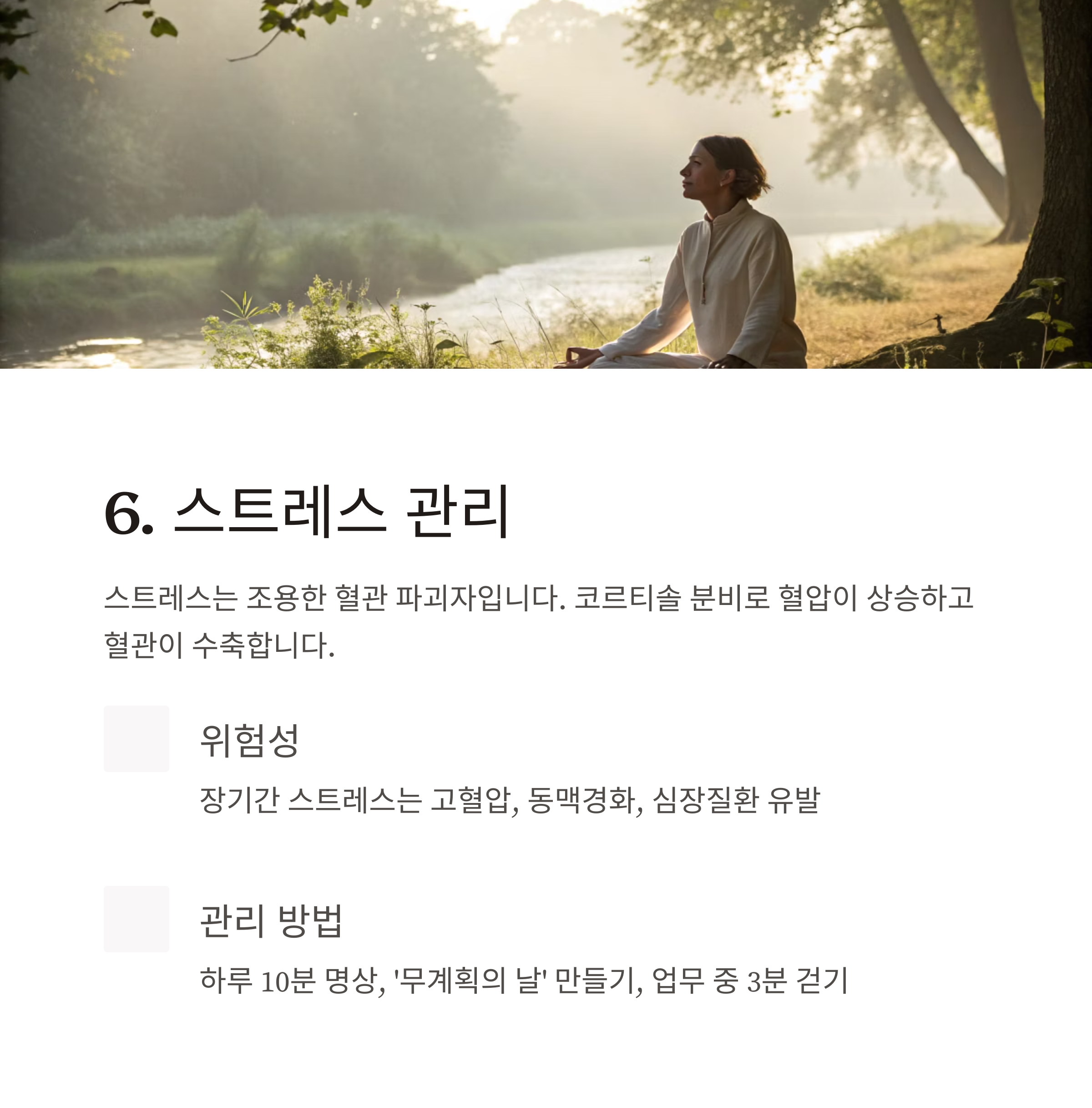 명상, 가벼운 취미생활, 산책 등으로 스트레스를 관리하면 혈관의 유연성과 회복력이 향상됩니다.