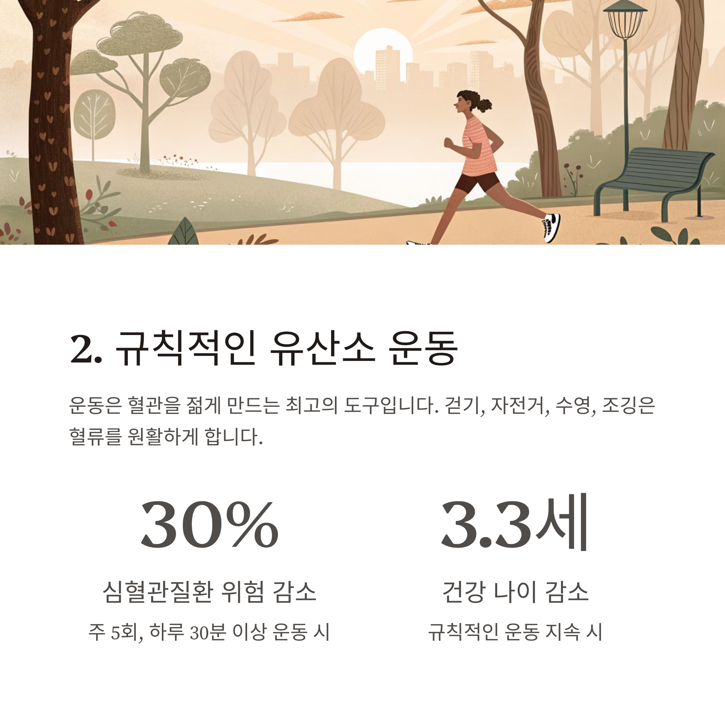 운동은 혈관을 젊게 만드는 최고의 도구입니다. 걷기, 자전거 타기, 수영, 가벼운 조깅과 같은 유산소 운동은 혈류를 원활하게 만들고, 혈관 내벽을 깨끗하게 유지하는 데 효과적입니다.