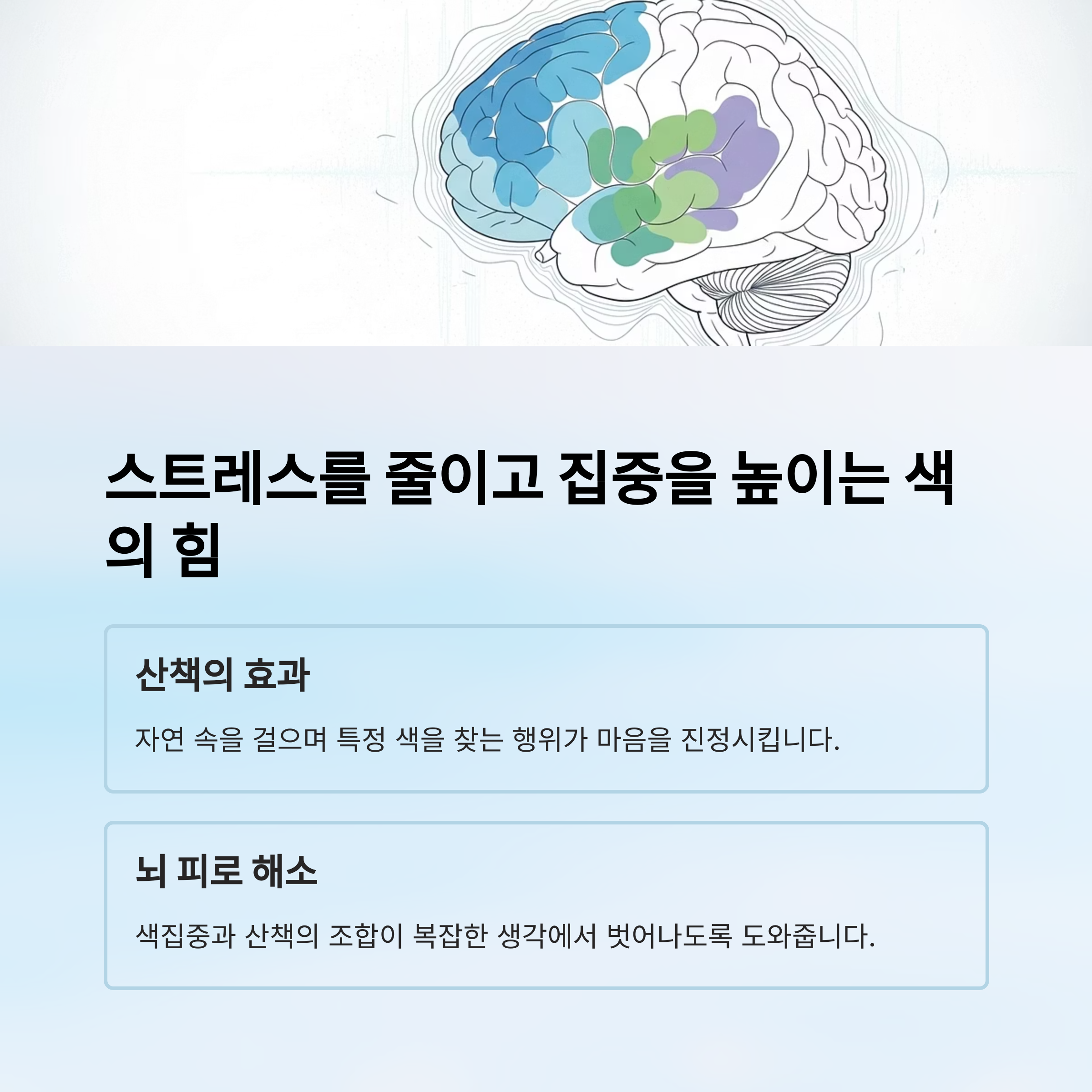 과도한 생각에서 벗어나도록 도와줍니다. 자연 속을 걸으며 특정 색을 찾는 행위 자체가 마음을 진정시키고,