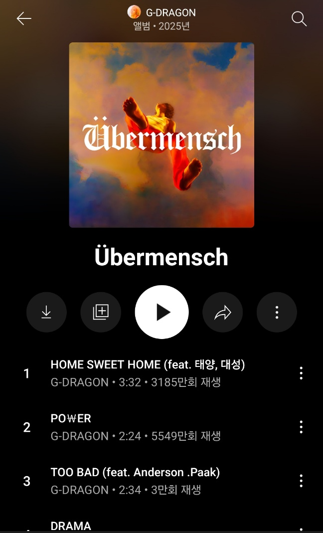지드래곤은 오는 2월 25일 오후 2시(KST)에 세 번째 정규 앨범 'Übermensch'를 발매할 예정입니다. 이번 앨범에는 다양한 장르의 곡들이 수록되어 있으며, 그중에서도 'Drama'와 'TOO BAD'가 많은 주목을 받고 있습니다.